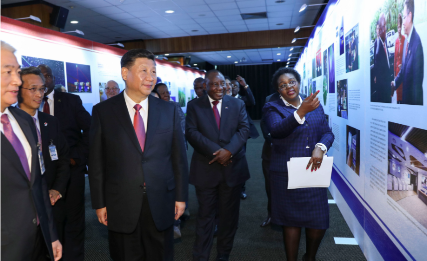2018年7月24日,中國國家主席習近平和南非總統拉馬福薩共同參觀由中國外文局承辦的中南科技創新合作成果圖片展