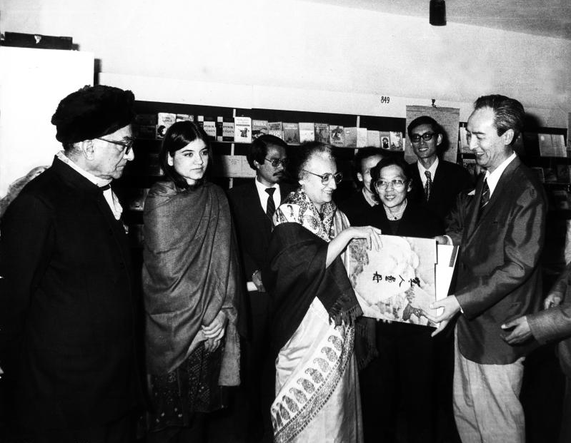 1982年,印度新德里第五屆世界書展,印度總理英·甘地夫人參觀中國展臺并接受中方代表贈送禮品