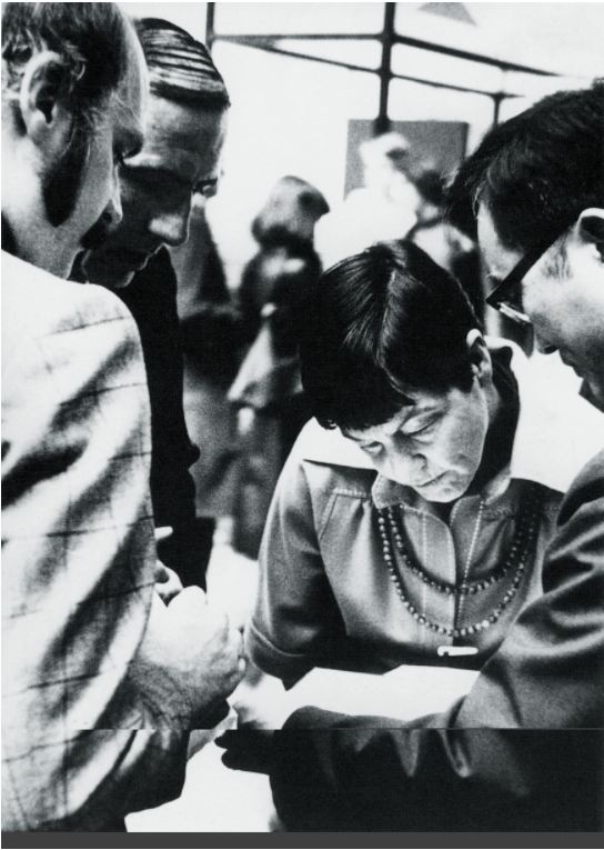 1975年10月,參加27屆法蘭克福國際圖書博覽會,德國總理施密特的夫人參觀中國展臺