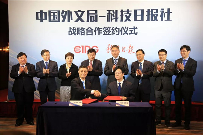 在活動現場,中國外文局副局長高岸明與科技日報社副社長房漢廷簽署了戰略合作協議,聯合工作機構——國際科技傳播中心正式揭牌成立。