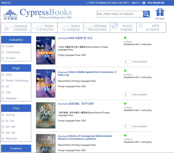 ▲外文局抗疫主題圖書上架常青公司官網,該網站為英國最大的中文圖書銷售平臺。