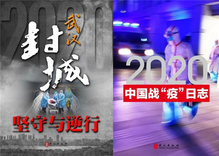 ▲外文局局屬各出版社出版的抗疫主題圖書。