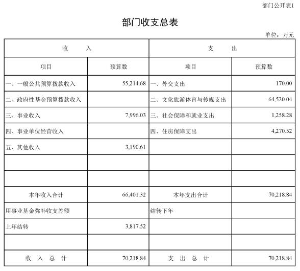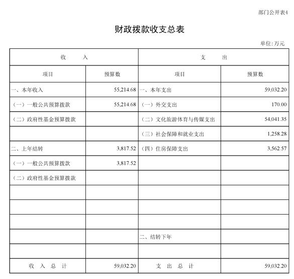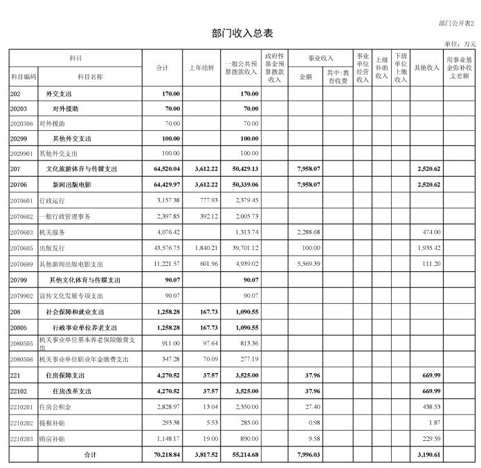 按照綜合預算的原則,中國外文局所有收入和支出均納入部門預算管理。收入包括:一般公共預算撥款收入、事業收入、其他收入、上年結轉;支出包括:外交支出、文化旅游體育與傳媒支出、社會保障和就業支出、住房保障支出等。中國外文局2020年收支總預算70,218.84萬元。