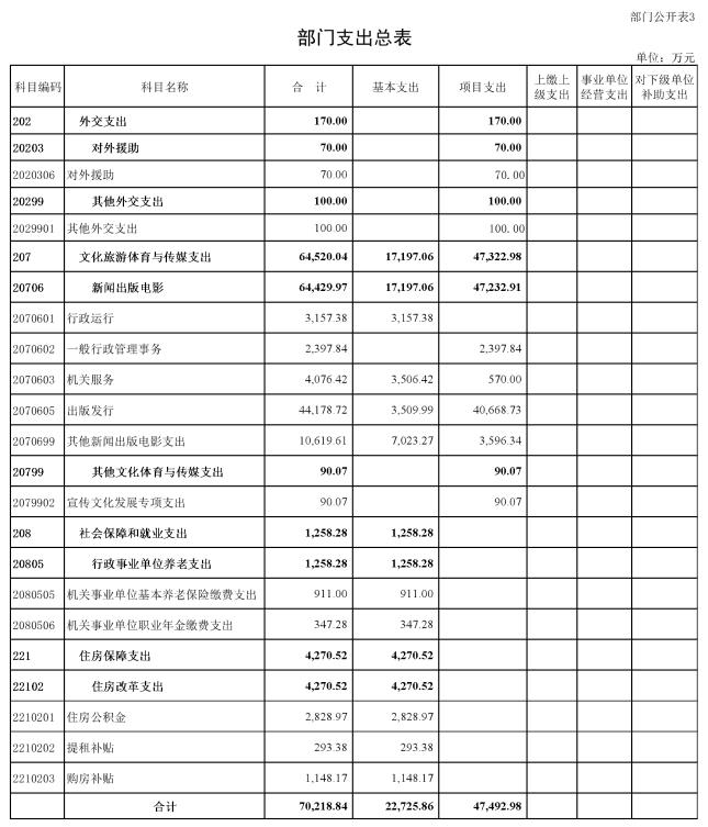 (十)文化旅游體育與傳媒支出(類)新聞出版電影(款)出版發行(項):指中國外文局下屬出版、發行單位的業務支出。