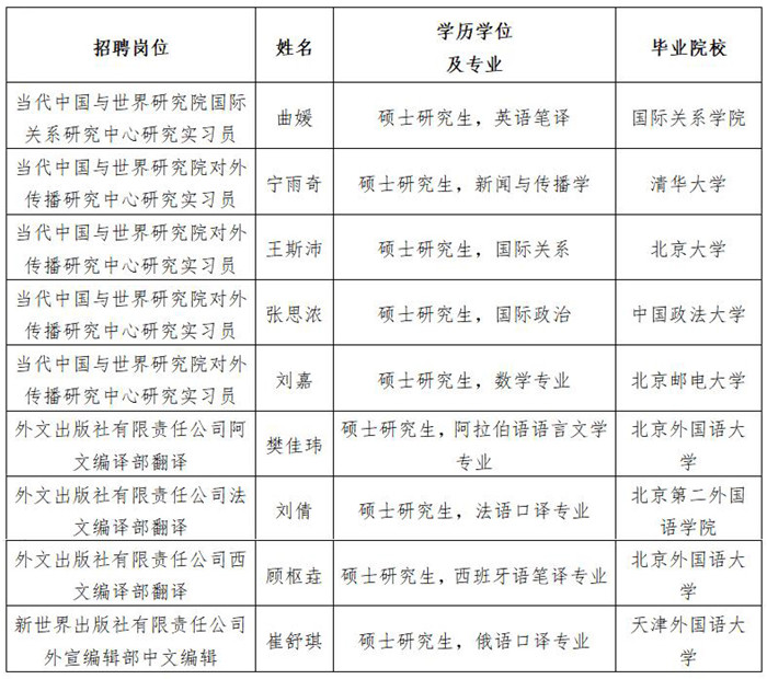 中國外文局所屬當代中國與世界研究院、外文出版社、新世界出版社2020年公開招聘擬聘用人員公示