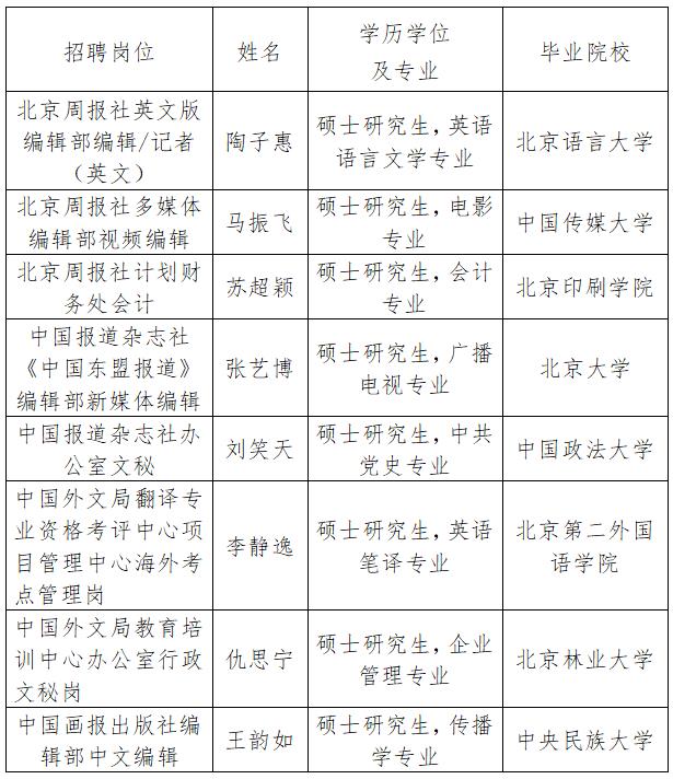 根據公開招聘工作有關規定和《中國外文局所屬企事業單位2020年度公開招聘工作人員簡章》,現將中國外文局所屬北京周報社、中國報道雜志社、翻譯專業資格考評中心、教育培訓中心、中國畫報出版社2020年度擬聘用人員予以公示。公示期間,如有問題,請向中國外文局反映。
