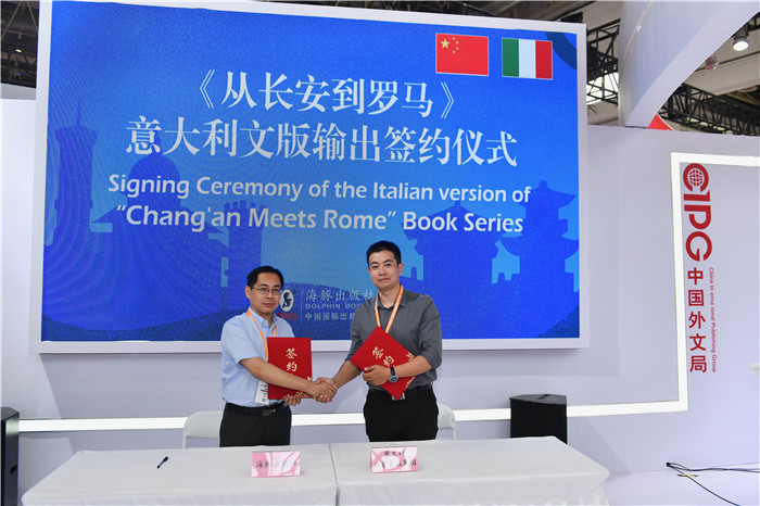 活動現場,海豚出版社與意大利白星出版集團負責人就《從長安到羅馬》意大利文版輸出進行簽約。