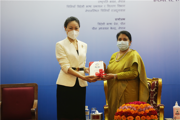 侯艷琪代表中方向班達里總統贈送《習近平談治國理政》第二卷尼泊爾文版和第三卷英文版