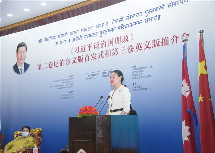 侯艷琪在致辭中表示,中國和尼泊爾是山水相連、世代友好的鄰居和朋友,也是共建“一帶一路”的重要合作伙伴?!读暯秸勚螄碚返谝痪砟嵛陌嬉唤洶l行就受到尼各界的高度關注和廣泛好評,相信第二卷尼文版和第三卷英文版將有助于尼泊爾讀者更好地了解中國領導人的執政理念、中華民族的夢想追求和中國改革發展的目標任務,進一步促進中尼兩國治國理政經驗交流。