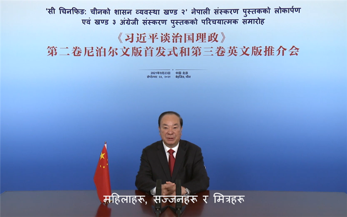 尼泊爾總統班達里出席活動并致辭,中共中央政治局委員、中宣部部長黃坤明,中國外文局局長杜占元分別發表視頻致辭。中國駐尼泊爾大使侯艷琪、尼泊爾中國研究中心執行主席巴特拉伊等各界人士參加了當天活動。
