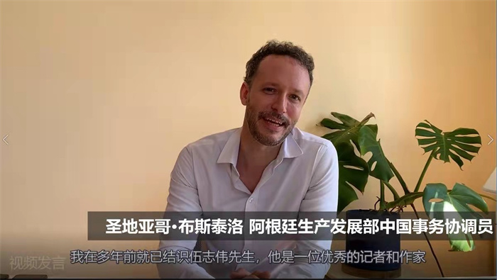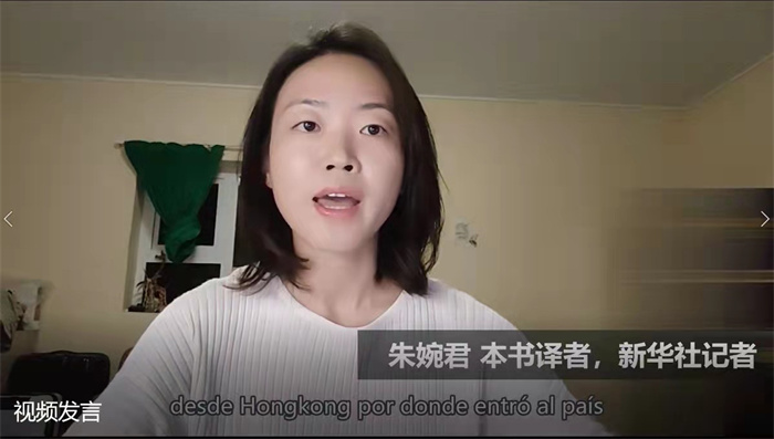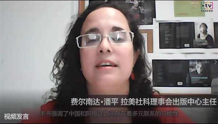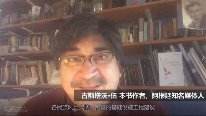 本書作者、阿根廷知名媒體人古斯塔沃·伍,阿根廷生產發展部中國事務協調員圣地亞哥·布斯泰洛,本書譯者、新華社記者朱婉君,拉丁美洲社會科學理事會出版中心主任費爾南達·潘平通過視頻進行發言。