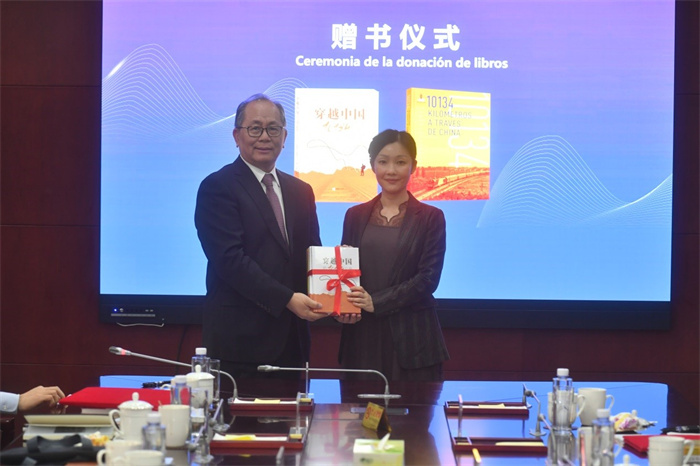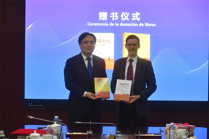邱小琪、陸彩榮分別向高程、牛望道贈送《穿越中國的10134公里》(中、西文版)新書。
