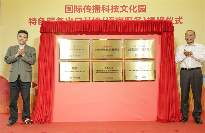 中國外文局局長杜占元,副局長陸彩榮、高岸明、劉大為、于濤及國圖集團主要負責同志,分別為國際傳播科技文化園特色服務出口基地(語言服務)、國際傳播科技文化園、國際傳播大廈、首批入駐國際傳播大廈的6家外文局局屬企業揭牌。首批入駐國際傳播大廈的6家外文局局屬企業是:海豚出版社有限責任公司、北京煦方國際數字文化傳媒有限公司、北京博聲國際文化交流有限公司、北京中外翻譯咨詢有限公司、北京長略信息咨詢有限公司和中外文國際傳播發展(北京)有限公司。