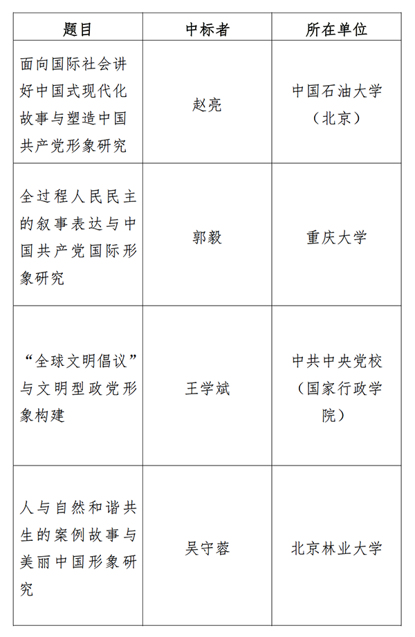 2023年度中國外文局“新時代中國共產黨國際形象與中國國家形象建設傳播創新工程”課題招標工作已結束,中國外文局委托中國對外書刊出版發行中心(國際傳播發展中心)組建評審委員會并完成全部評審工作?,F將課題中標結果公示如下,公示期為2023年5月19日至5月25日。