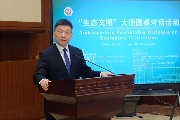 6月6日,“生態文明”大使圓桌對話活動在貴州舉行,中國外文局副局長于濤、北京外交人員服務局局長李立出席活動并致辭。貴州省副省長張敬平,科技部原副部長劉燕華,國家氣候變化專家委員會副主任、第十四屆全國人大常委會委員王毅及來自20個國家的駐華使節、國際組織代表出席并圍繞“現代化進程與生態文明建設”主題進行研討交流。