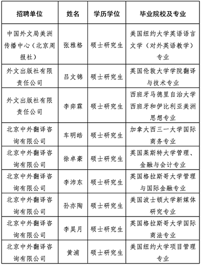 根據有關規定和《中國外文局所屬企事業單位2023年海外留學生招聘公告》,現將中國外文局美洲傳播中心(北京周報社)、外文出版社有限責任公司、北京中外翻譯咨詢有限公司3家單位2023年度擬接收海外留學生予以公示。公示期間,如有問題,請向中國外文局人事部反映。