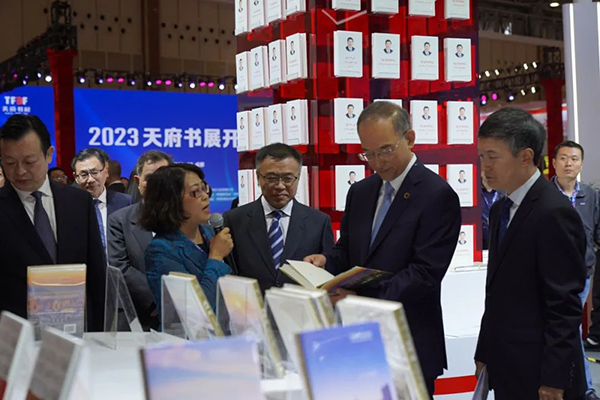 10月13日至16日,2023天府書展在四川成都舉行。開幕當天,四川省委副書記、省長黃強,新聞出版總署原署長柳斌杰,中國出版協會理事長、國家新聞出版廣電總局原副局長鄔書林及中宣部有關部門負責人到中國外文局展區巡館,了解中國外文局翻譯出版與對外宣介習近平總書記重要著作的相關情況,翻閱“絲路百城傳”“讀懂中國”等重點品牌系列圖書,并具體了解中國外文局在中華文化與文明、中國式現代化、“一帶一路”等重大主題對外出版方面的工作成果。中國外文局副局長劉大為陪同。