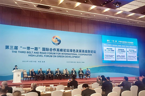 10月18日,中國外文局支持完成的智庫研究成果《綠色“一帶一路”十周年創新理念與實踐案例(中英文版)》在第三屆“一帶一路”國際合作高峰論壇“綠色發展高級別論壇”亮相,面向多國元首、部長、駐華使節等重要嘉賓推介。中國外文局副局長于濤出席論壇見證推介活動。