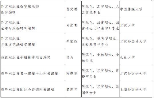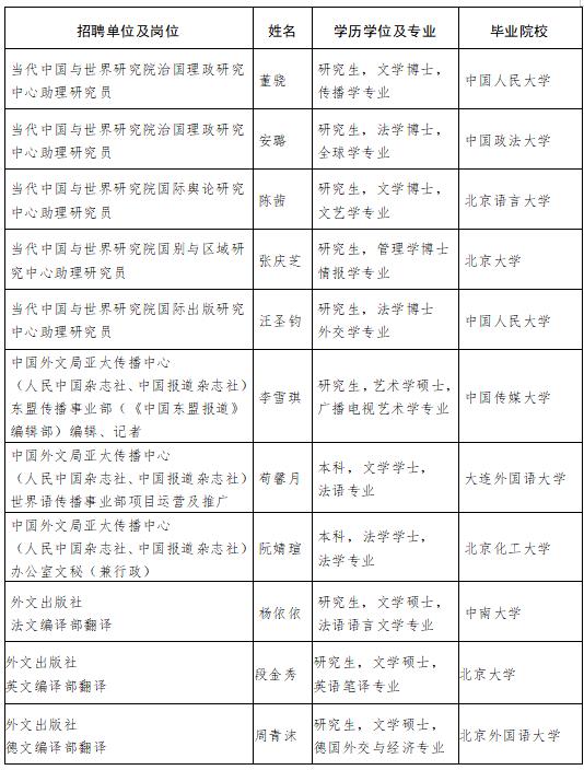 根據公開招聘工作有關規定和《中國外文局所屬企事業單位2024年度公開招聘工作人員公告》,現將中國外文局所屬當代中國與世界研究院、中國外文局亞太傳播中心(人民中國雜志社、中國報道雜志社)、外文出版社有限責任公司、海豚出版社有限責任公司、朝華出版社有限責任公司等5家單位2024年度擬聘用工作人員予以公示。公示期間,如有問題,請向中國外文局反映。