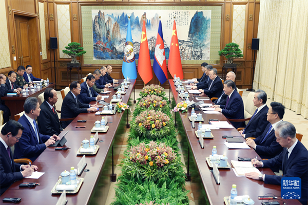習近平指出,當前,國際形勢變亂交織,全球性挑戰層出不窮,考驗著各國的應對和選擇。中柬兩國都致力于做世界的和平力量、發展力量、進步力量。中方將繼續支持柬埔寨在國際和地區事務中發揮更大作用,壯大“全球南方”力量,支持東盟堅持戰略自主,維護中心地位,堅決反對外部勢力將冷戰思維引入本地區,堅定不移推動東盟一體化和共同體建設。中方愿同柬方堅定道不改、志不變的決心,增強底線思維,加強協作和配合,共同應對各種風險。