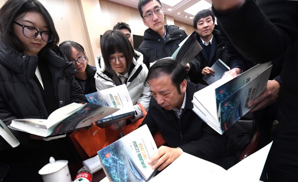 于濤、宋強太、胡開敏、張志方向鐵路12306科創中心職工代表贈送新書。