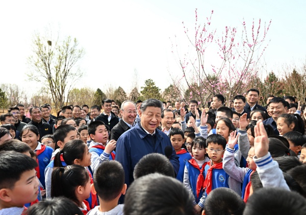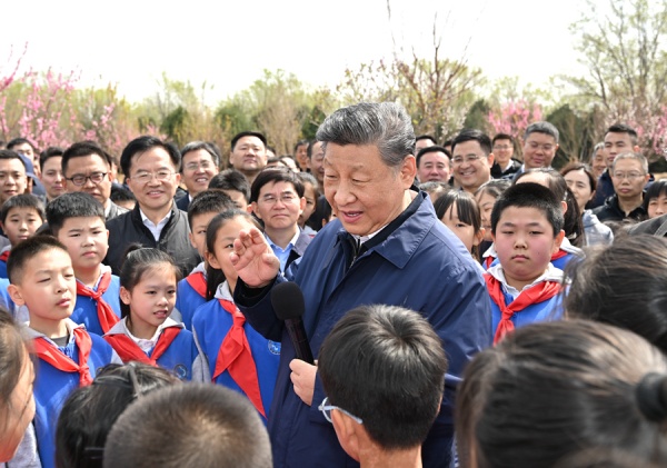 4月3日,黨和國家領導人習近平、李強、趙樂際、王滬寧、蔡奇、丁薛祥、李希、韓正等來到北京市豐臺區永定河畔參加首都義務植樹活動。這是習近平同在場的干部群眾、少先隊員親切交談。(新華社記者 燕雁 攝)