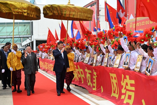 數百名當地民眾揮舞兩國國旗,手持“柬中友誼、團結、合作萬歲!”等紅色橫幅,熱烈歡迎習近平到訪。