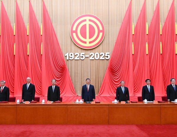 人民大會堂大禮堂氣氛隆重熱烈。主席臺上方懸掛著“慶祝中華全國總工會成立100周年暨全國勞動模范和先進工作者表彰大會”會標,后幕正中懸掛中國工會會徽,會徽下方是“1925-2025”字標,10面紅旗分列兩側。二樓眺臺懸掛著標語:“以習近平新時代中國特色社會主義思想為指導,堅定不移聽黨話跟黨走,在以中國式現代化全面推進強國建設、民族復興偉業中充分發揮工人階級主力軍作用和工會橋梁紐帶作用!”