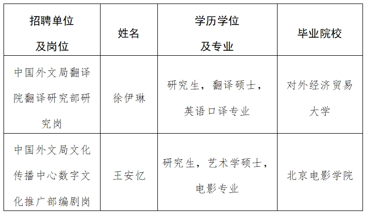 根據事業單位公開招聘工作有關規定和《中國外文出版發行事業局所屬企事業單位2025年度公開招聘工作人員公告》,現將我局所屬中國外文局翻譯院、中國外文局文化傳播中心2家單位2025年度擬聘用事業單位工作人員予以公示。公示期間,如有問題,請向我局反映。
