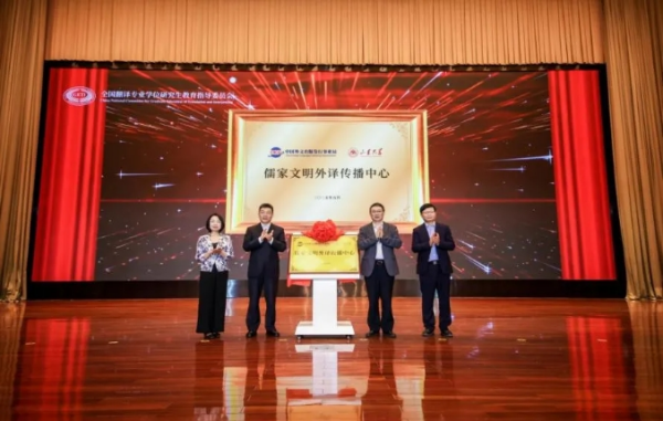 會上還舉行了儒家文明外譯傳播中心揭牌儀式。中國外文局副局長、教指委主任委員于濤,山東大學常務副校長吳臻,中國翻譯研究院副院長、教指委委員楊平和山東大學外國語學院院長、翻譯學院院長馬文共同為儒家文明外譯傳播中心揭牌。