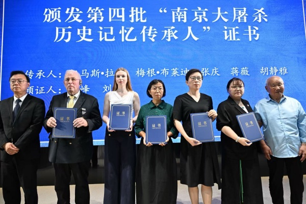 此次活動還宣布了第四批“南京大屠殺歷史記憶傳承人”名單,包括托馬斯·拉貝和梅根·布萊迪在內的6位國際友人和“南京安全區”工作人員、幸存者以及歷史證物守護者的后代在列。周峰和南京大屠殺幸存者劉民生為他們頒發證書。