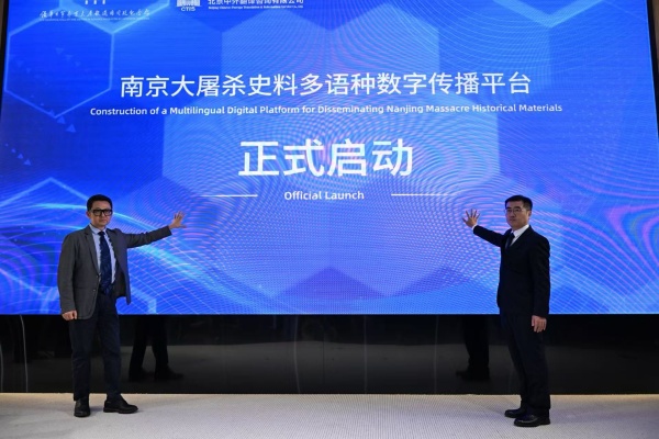 中共南京市委宣傳部常務副部長、南京市新聞出版局(市版權局)局長彭振剛與北京中外翻譯咨詢有限公司董事長蔣祥共同啟動了“南京大屠殺史料多語種數字傳播平臺”。