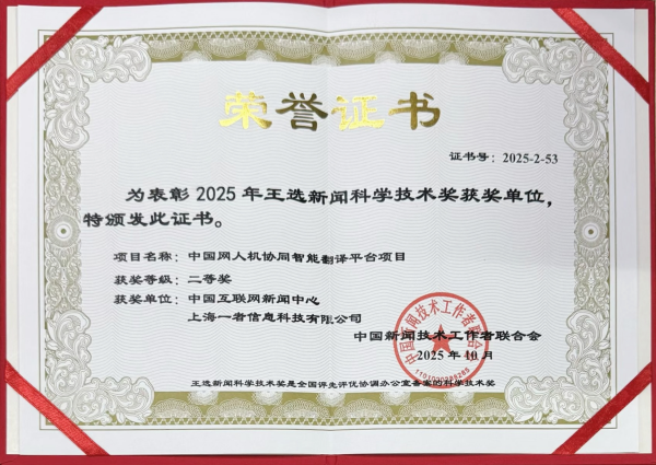 10月31日,中國新聞技術工作者聯合會2025年學術年會暨王選新聞科學技術獎頒獎大會在四川成都舉行,中國網申報的“人機協同智能翻譯平臺”項目榮獲王選新聞科學技術獎(項目獎)二等獎。